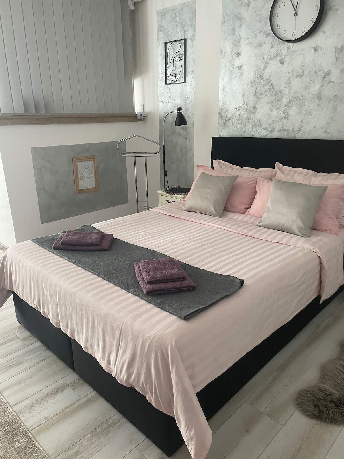 Acest apartament se afla intr-o zona ultracentrala a orasului, foarte aproape de Pietonala si de Teatru, cu acces usor catre restaurante si magazine. De asemenea, blocul este mai retras, avand in jurul lui mult spatiu verde. Apartamentul este format din 2 camere decomandate, una cu pat de 160 cm, iar cealalta cu canapea extensibila (accesul pe balcon se face din aceasta camera). Apartamentul este recent mobilat, dispunand de toate facilitatile necesare unei sederi mai scurte sau mai lungi.