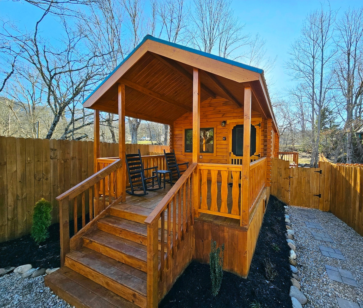 Begin your vacation by relaxing in rocking chairs on a porch overlooking a beautiful mountain stream. Our cabin is located in a peaceful country setting close to hiking trails, white water rafting, horseback riding and fishing. We are located one mile from the entrance to the Great Smoky Mountains National Park. All the attractions of Gatlinburg and Pigeon Forge are just a short drive away. Our one-bedroom cabin has all of the amenities needed for a wonderful vacation experience.