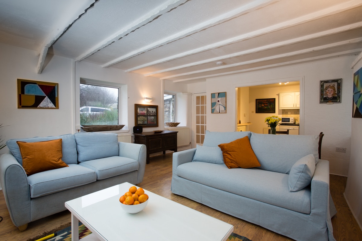 Ty Venda is a two-bedroom annexe with an open-plan lounge, diner, and fitted kitchen. On the first floor are two bedrooms; one has a standard double bed and the other a smaller 4ft double suitable for one adult or two children. The bathroom has a gas-heated shower and WC. There is an additional WC on the ground floor. Patio doors lead out onto the garden, which is fully enclosed, making it secure for any fur babies that visit. It is equipped with a picnic table and benches for alfresco dining.