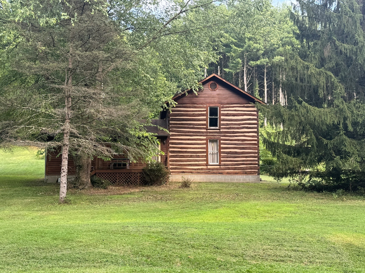 Our hi-end cabin offers a beautiful country setting on 4 acres and comes equipped with luxurious bedroom suites! Soak in the hot tub and enjoy the peaceful view from the log cabin deck or sip a fresh cup of coffee on the hickory rocking chairs on the front porch. Our family-friendly space comfortably sleeps 11 guests, and larger groups are welcome! The large lawn is perfect for games, tent camping, and quality time around the campfire. Come experience our cozy space, make your reservation today!