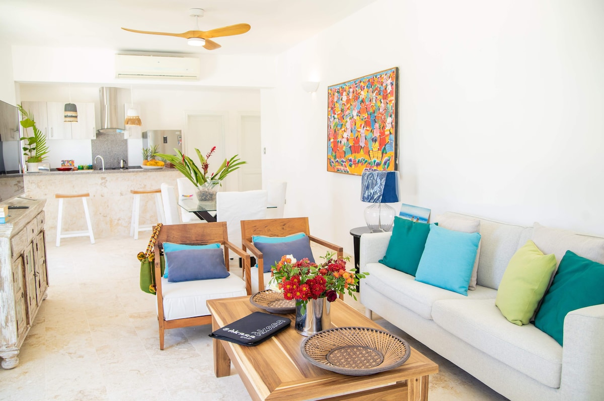 Welcome to our tropical villa, located in the Los Nomadas residence, just a 2-minute walk from the beautiful Playa Coson. This peaceful haven offers the perfect blend of comfort and Caribbean charm. With 24/7 security, a tranquil and relaxed atmosphere is guaranteed, only 10 minutes from the town center. Whether you wish to unwind on pristine beaches, explore local attractions, or enjoy nature, our villa is the ideal starting point for your tropical getaway.