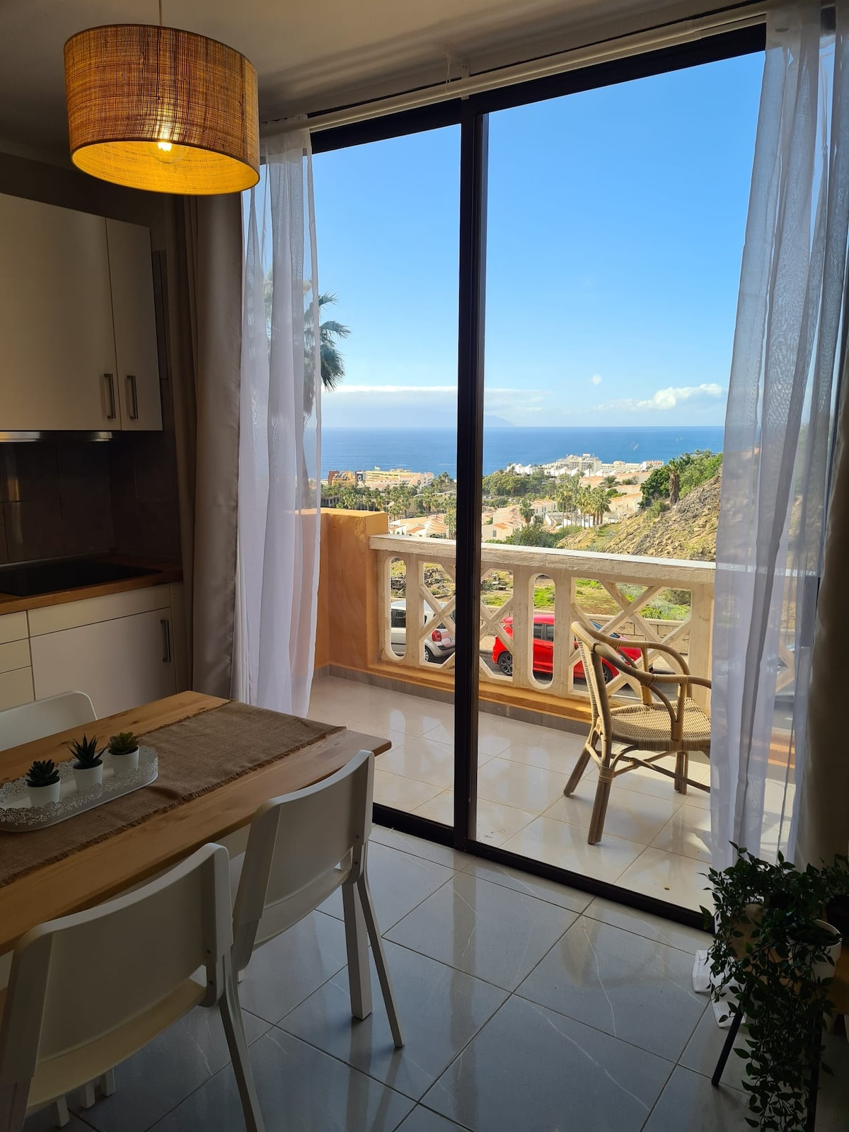 Checkout my fully equipped 1 bedroom newly renovated and comfortable apartment in the heart of Playa de las Americas (the most vivid region) in Tenerife just 1 street from the sea! Enjoy the direct ocean balcony view, a king size anatomic double bed, free Wifi up to 300Mbps, free access to the pool, free parking, new IKEA kitchen with oven and all kitchenware of highest quality, new electric appliances, sleeping sofa, laundry, LCD TV and much more!
