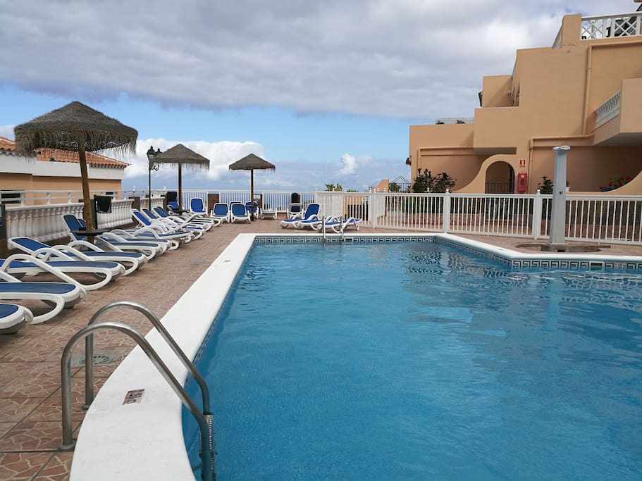 Fantastic new, private and very quiet apartment with 2 swimming pools, it is 4 minutes from the wonderful white beach of La Pinta, next to Puerto Colon, surrounded by shops, restaurants, bars, 600 meters from the Siam Park water park The apartment has a room with 2 single beds, a living room with a sofa bed for 2 people, a new and fully equipped kitchen and a bathroom with a shower, a terrace with beautiful views of the pool, ideal for families.