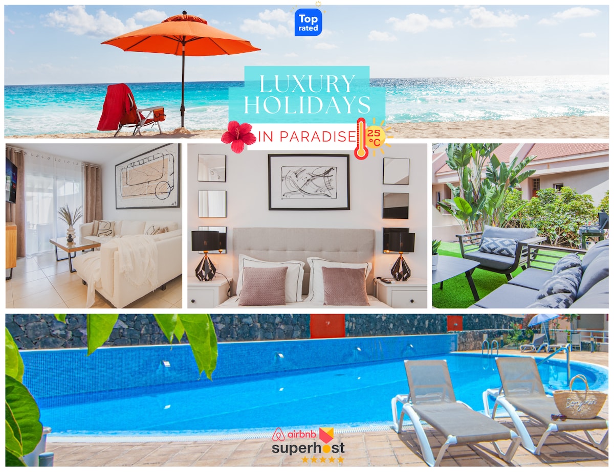 Nueva vIlla recién reformada con piscina privada climatizada y gran jardín de 300 metros cuadrados ubicada en primera línea del mar, en un entorno de hoteles de lujo como Sheraton La Caleta, Riu Palace, Coral Suites, H10 costa Adeje. Además forma parte del Residencial Adeje Park donde hay 3 piscinas, una de ellas climatizada y parque infantil. La famosa playa del Duque está a 800 metros a pie. También está muy cerca de la caleta de Adeje, un pueblo marinero famoso por sus numerosos restaurantes
