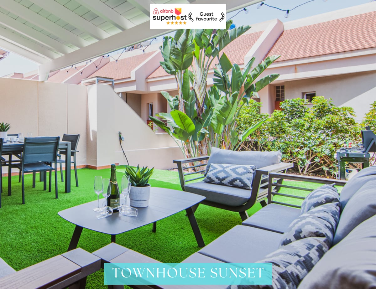 Esclusiva casa a schiera con terrazza e jacuzzi panoramica. Godetevi la sala multifunzione insonorizzata con cinema, PlayStation e area party! Relax assicurato con piscine condominiali, barbecue nel cortile tropicale e interni eleganti. Dotazioni premium: cucina completamente attrezzata, aria condizionata in ogni stanza, garage privato, Wi-Fi veloce e lavatrice/asciugatrice. L'ambiente perfetto per momenti indimenticabili con amici o famiglia, a breve distanza dalle attrazioni di Costa Adeje.