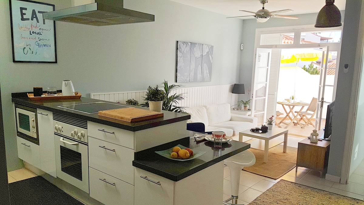 Encantador apartamento recién reformado para hasta 4 personas. Cuenta con una habitación con cama de matrimonio y un sofá cama para 2 personas. Tiene todos los utensilios básicos para pasar una estancia cómoda y agradable. Está situado en una zona tranquila, donde encontrarás todos los servicios que necesitas a poca distancia. Supermercado, farmacia, restaurantes, taxi... En coche, estás a sólo 10 minutos de la playa El Duque y a 5 minutos del espectacular sendero del "Barranco del infierno".