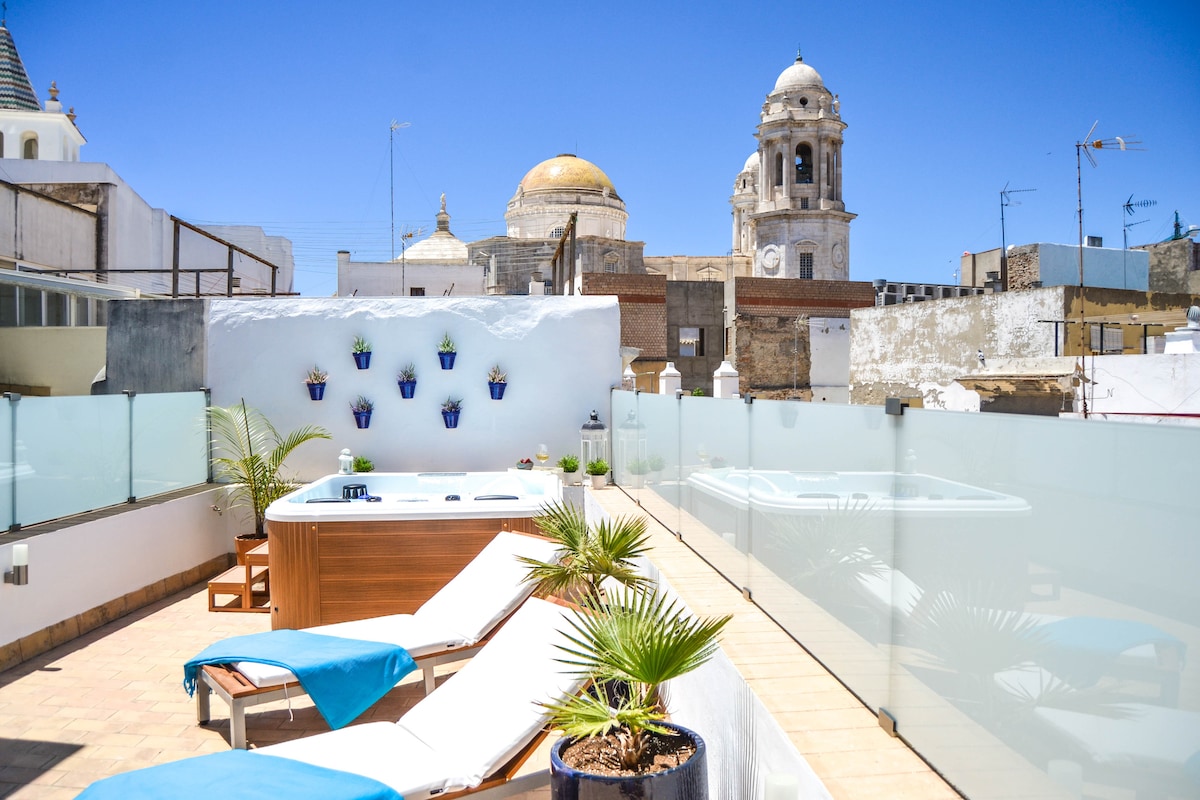 Stunning 2 bedroom apartment with FULL BEDS in the heart of Cádiz. Two large private terraces & jacuzzi where to relax enjoying amazing views of the Cathedral Bright and airy penthouse set in a new building with marble floors & cozy decoration. Centrally located at Plaza de la Catedral and Market. Many restaurants and shops around Beach: 10 minutes away. Parking available at AV CAMPO DEL SUR, 15 COST: 15 eu/day
