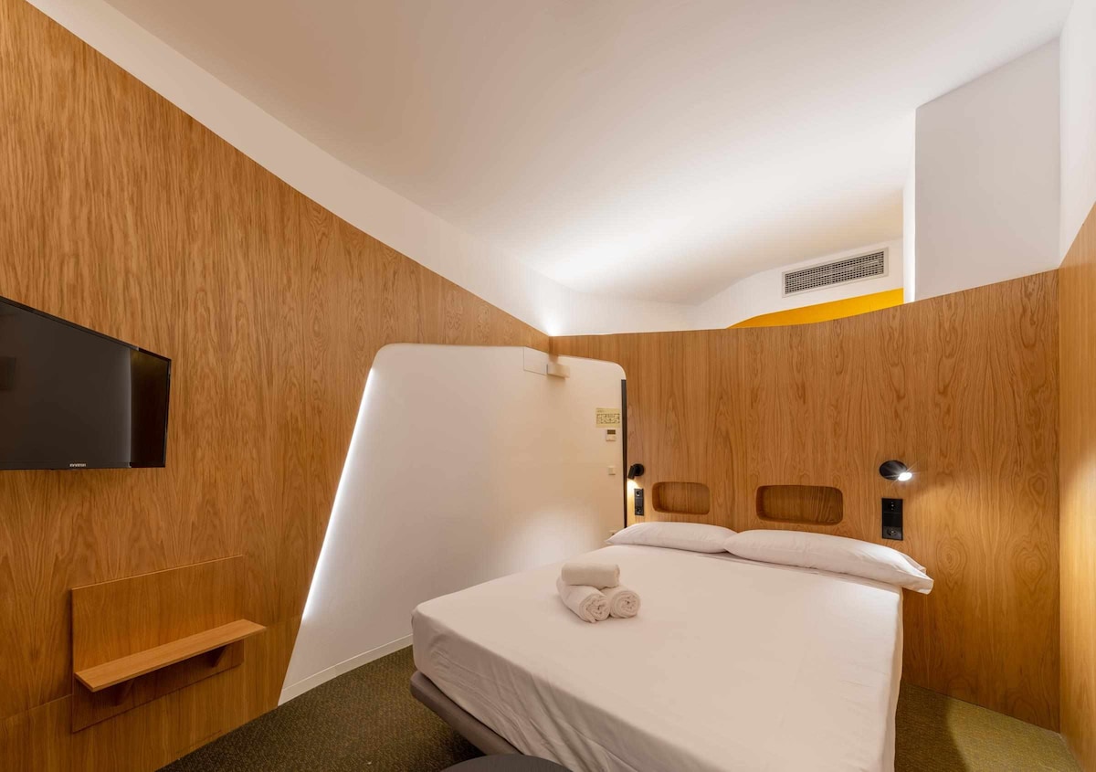 Family room with private bathroom – 3 or 4 beds – 25m² of surface Includes: 1. One double bed (1.90m x 1.80m) and two single beds (1.90m x 0.90m), or four single beds (please inform reception of your preference). 2. Full private bathroom. 3. Wardrobe with hangers. 4. Reading lamp for each bed. 5. Adjustable air conditioning (hot and cold). 6. Natural lighting. 7. Direct ventilation to the outside. 8. Bed linen included. 9. Towel rental service available.