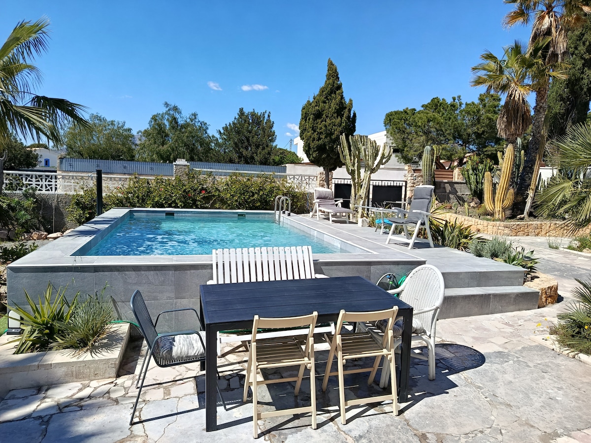 Sunny villa with private saltwater pool and a large garden (200 m2) with fruit trees, eco-friendly with solar panels, sea views, just 5 minutes from the beach. 100 m2 terrace with pergola to spend time outdoors and enjoy the fantastic weather. The house itself has 130 m2 with 2 storeys. Recently refurbished. Plenty of space for sunbathing, playing and relax in a Mediterranean environment. The house faces south, perfect orientation. Near the town center of Santa Pola.