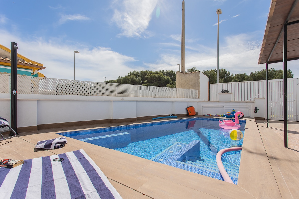 Sunny villa with private saltwater pool and a large garden (200 m2) with fruit trees, eco-friendly with solar panels, sea views, just 5 minutes from the beach. 100 m2 terrace with pergola to spend time outdoors and enjoy the fantastic weather. The house itself has 130 m2 with 2 storeys. Recently refurbished. Plenty of space for sunbathing, playing and relax in a Mediterranean environment. The house faces south, perfect orientation. Near the town center of Santa Pola.