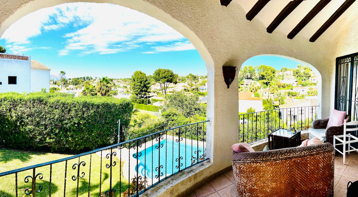 Quiet Mediteranean House with stunning views, heated swimming pool, 9 minutes walk to the wonderful white old town of Altea. 15 min walk down to the sea. 1st floor private for the guests, with dining room, 3 bedrooms and two bathrooms. Big private terrace, outdoor wood furniture, gas barbeque, garden with a beautiful pine tree and wide views. Heated pool, with separate terrace, private use only guest and owner, preferent for the guest. The owners live in the upper floor, with other terraces.