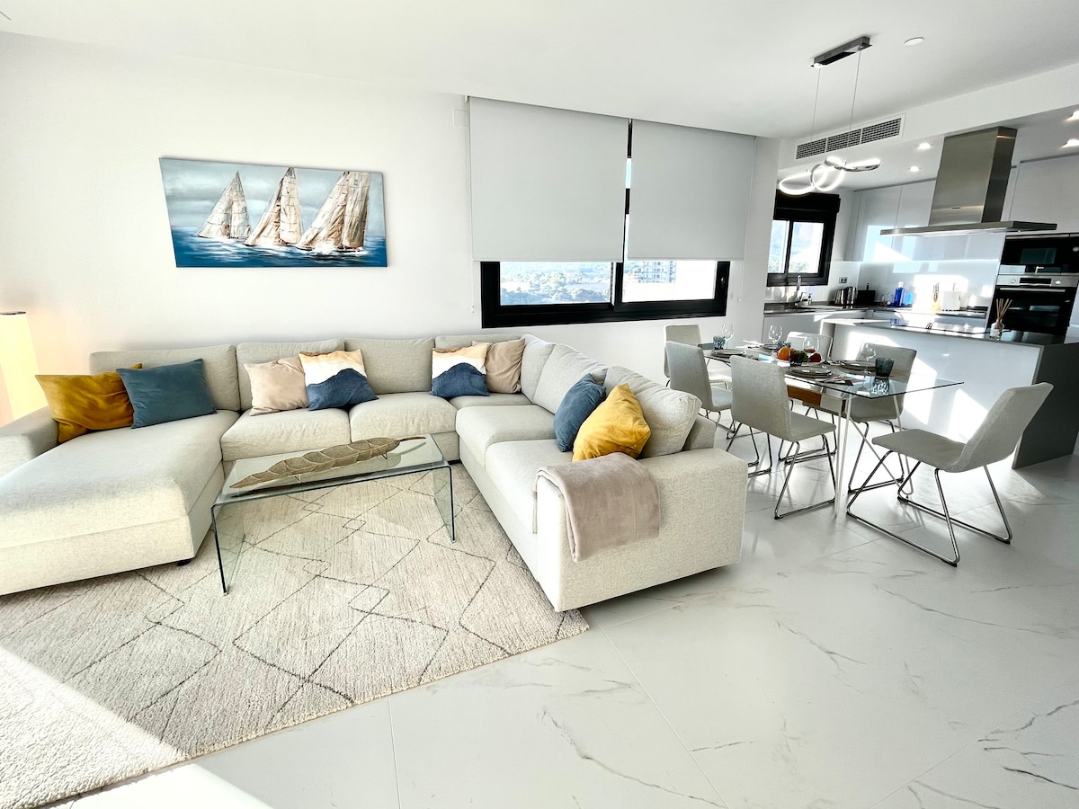 Delightful apartment next to Poniente beach, 150 meters from the sea. The apartment is located on the 9th floor of the new luxury complex Sunset Cliff with amazing infrastructure. It offers a large panoramic pool with umbrellas and sun loungers, a pool and a jacuzzi with heated water, which are available all year round, several playgrounds, tennis and paddle courts, football and basketball courts, a large gym overlooking the pool and the sea, free indoor parking.