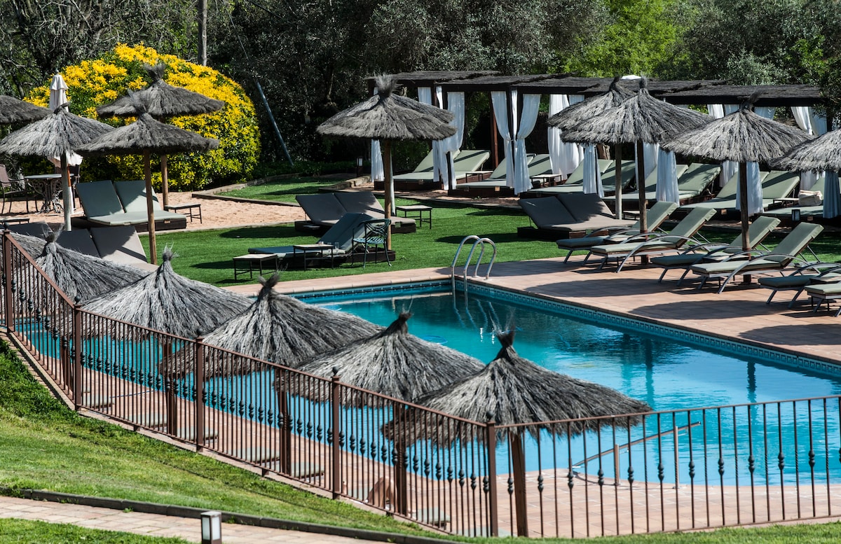Rejuvenate in this elegant 39m2 suite with a bohemian design that invites travel... It comfortably accommodates 2 double bedrooms with TV, one with a king size bed and the other with 2 separate single beds, all dressed in cotton and linen, a bathroom with walk-in shower and towel rail, separate toilet. Nespresso machine, courtesy tray. Free wifi, daily cleaning included. Access to the patio, swimming pool and lounge. Breakfast is optional, 13,50€.