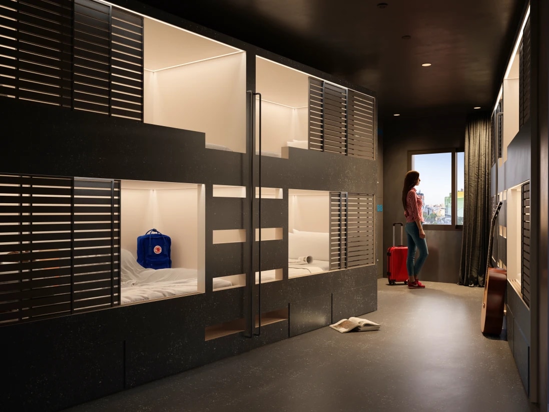 Bed in shared dorm with shared bathroom. Each bunk has a curtain for privacy, a private locker, plug, light, USB C charger, private curtain, clothes hanger. All bed linen and duvet is included in the price. WI-FI throughout the hostel. Air conditioning, ventilation and heating throughout the hostel. At the reception you can buy padlocks for the locker and rent shower towel. Our mattresses and pillows are specially designed to ensure maximum comfort and rest.