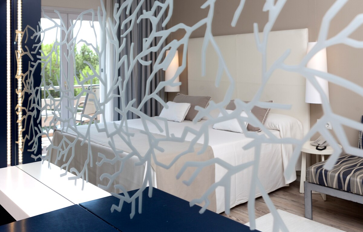 Overlooking the pool and the solarium area, the rooms recreate a mediterranean and functional style, with a terrace to enjoy the hotel's outdoor pool & natural solarium. Everything you need after a relaxing day as a couple or family. Services include : 2 individual beds and an extra sofa bed, aircondition, heating, safe, phone, tv, wifi and hairdryer. Tourist tax not included 0,66€/night paid upon arrival at the hotel.