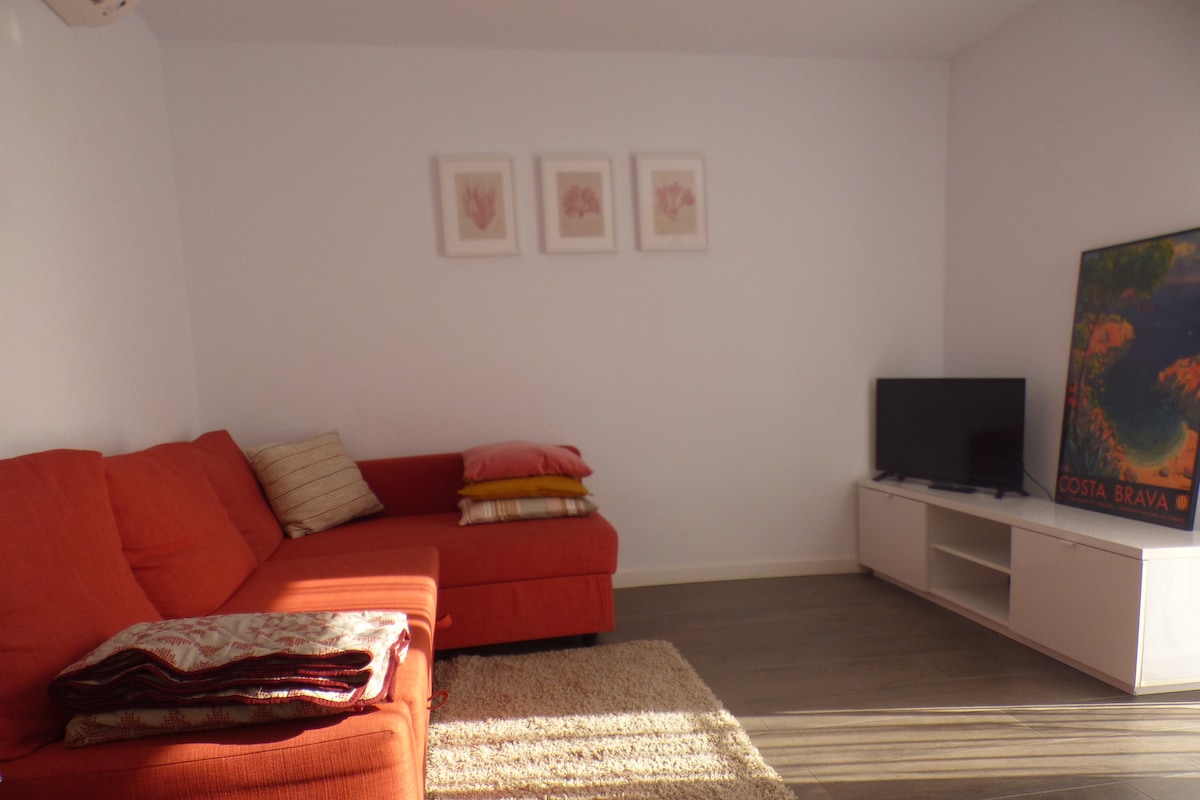 1 km del centre, 150m de la platja i 450m de 2 supers. Estudi reformat: 35 m2 (2 persones). Diàfan i acollidor dins d'un loft d'artista amb pintura empordanesa i piano. Cuina americana amb rentavaixelles, nevera i forn/microones. Saló/dormitori (sofà llit molt còmode: matalàs 1’6m ample) TV, Terrassa amb rentadora. Bany i banyera hidro i dutxa. Wifi - Fibra Òptica. Possibilitat pàrking nocturn. 10% dte x una setmana. Altres dtes. en estades llargues Serveis d'oficina en cas convenient.