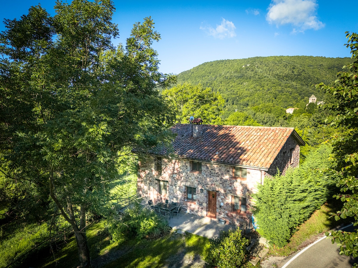 Country House in Rocabruna, Camprodon, Catalan Pyrenees. Quiet and lots of light. Incredible views of the Alta Garrotxa. Nature, landscapes and fresh air. Country house with absolute quietness, outdoor spaces, ideal for different types of activities: resting, sun, games, barbecues... And much more! We offer many indoor spaces. Our purpose is to look for comfort and quality respecting the environment and the characteristics of the old "Masia Catalana"