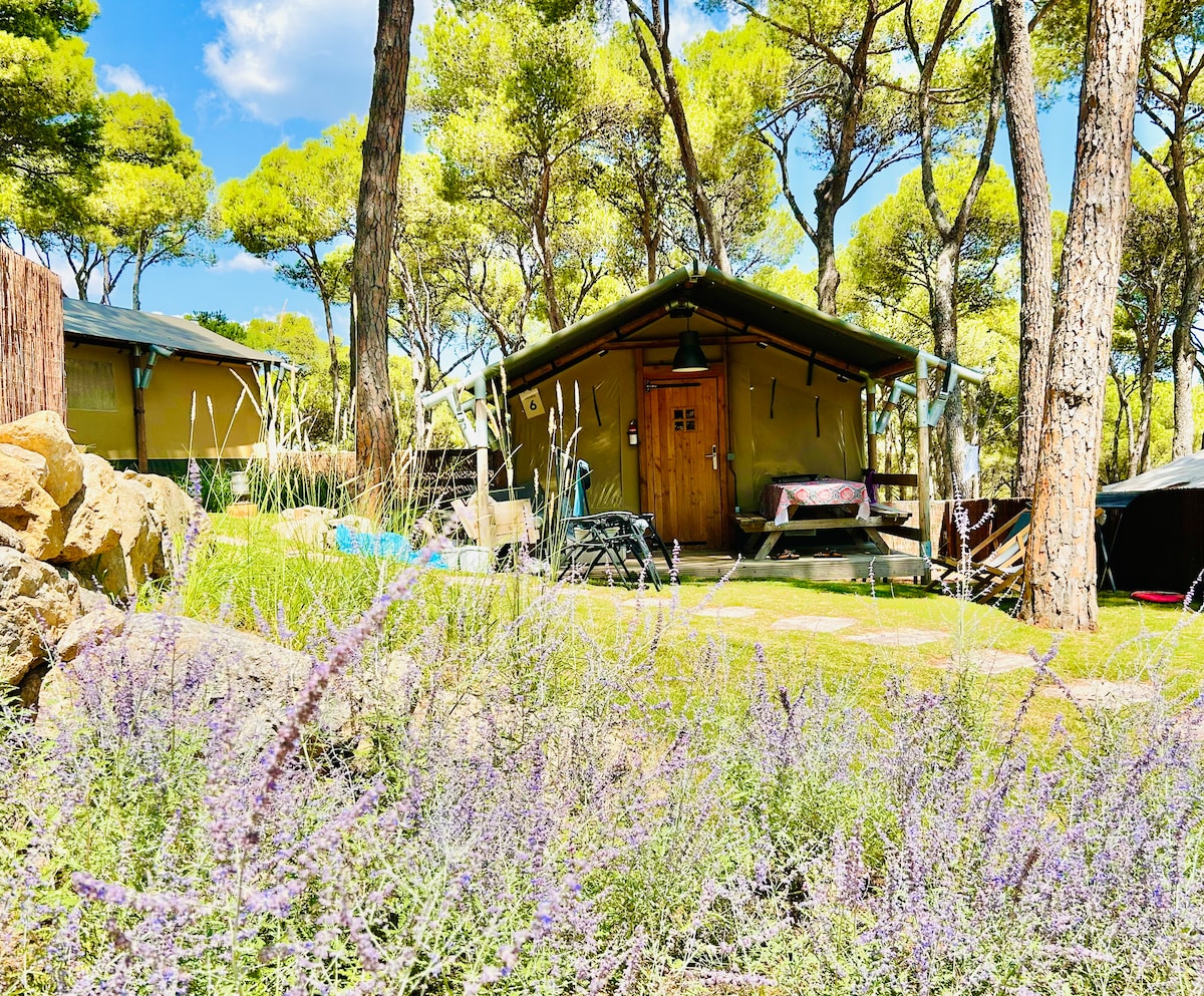 Tiendas glamping situadas en la parte media-alta del resort. Capacidad para 4 personas. Disponen de dos dormitorios, uno con cama de matrimonio (150x200) y otro con litera de camas individuales (80x200); cocina equipada. Terraza cubierta con sofá y mesa de madera para pícnic. No dispone de baño pero sí de agua corriente, deben utilizarse los baños y duchas de la zona común de acampada. Sábanas y toallas no incluidas (ofrecemos servicio de alquiler). No se aceptan mascotas.