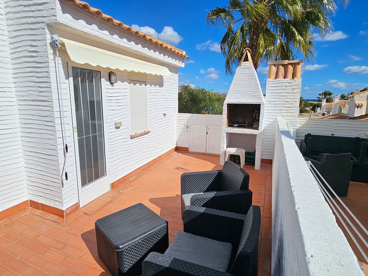 This private self-check-in bungalow near Villamartin Golf Course features 2 bedrooms and 1 bathroom, a fully equipped kitchen and a stunning rooftop solarium with a dining area and BBQ. The bungalow is newly renovated, including brand-new air conditioning, kitchen appliances, beds, mattresses and furniture. There is a private community pool (1 min walk), Villamartin Golf courses (2 min drive) and one of the biggest shopping center Zenia Boulevard for anything you need (5 min drive).
