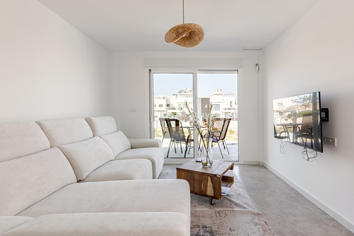 Descubre este apartamento en Gran Alacant: espacio diáfano, jacuzzi para dos, vistas al mar desde ventanales y terraza, cocina completa, smart TV de 65", internet de alta velocidad, aire acondicionado y detalles como iluminación LED. Ideal para parejas en escapadas románticas o teletrabajo tranquilo. Aparcamiento fácil. Cerca de playas y ocio. Diseño moderno y elegante. Ideal para parejas o teletrabajar.