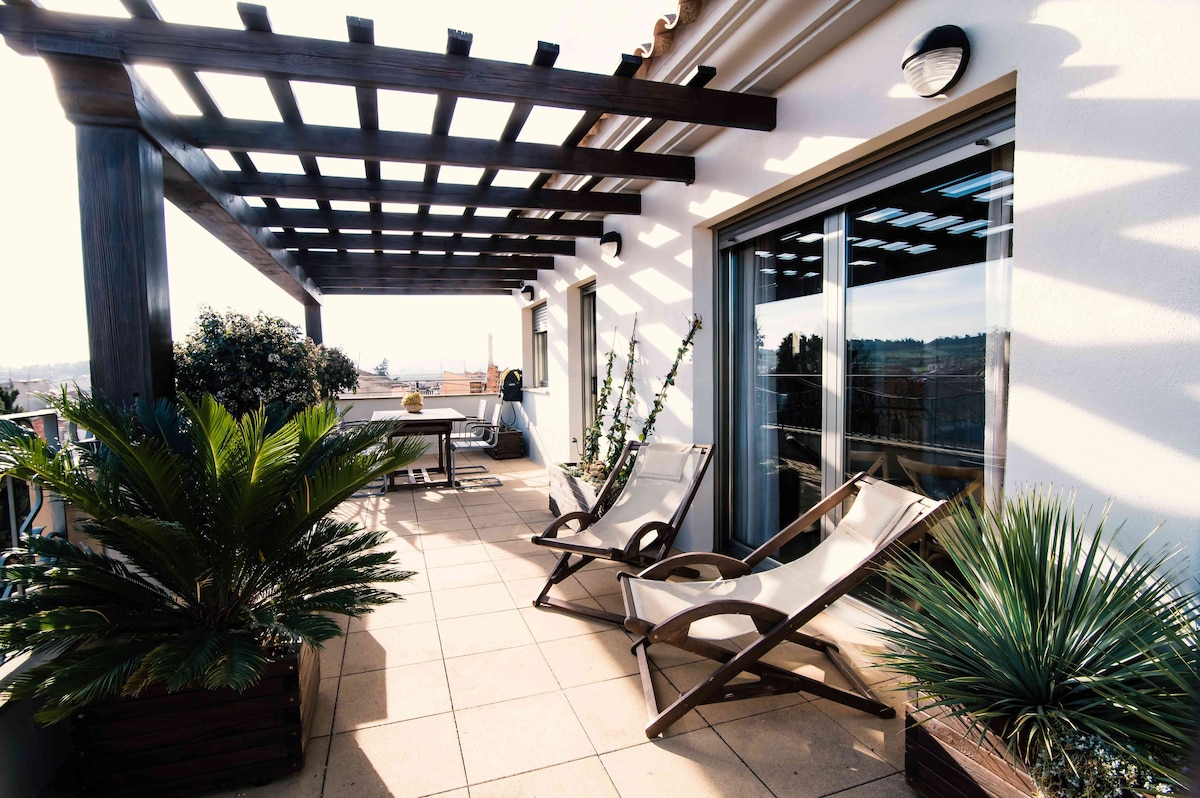 CASA ESMERALDA is conveniently located just a 5-minute walk from both the train station and the city centre, and only 10 minutes from the bus stop and Sant Sebastia Beach. BCN city is 45 min by train. This stylish 100 m² apartment is designed for comfort. It features one bedroom with a spacious 150×190 cm bed and includes two bathrooms—one with a bath and the other equipped with a modern Italian shower. Additionally, the apartment has a terrace with a PRIVATE unheated pool (2.5×3 mts).