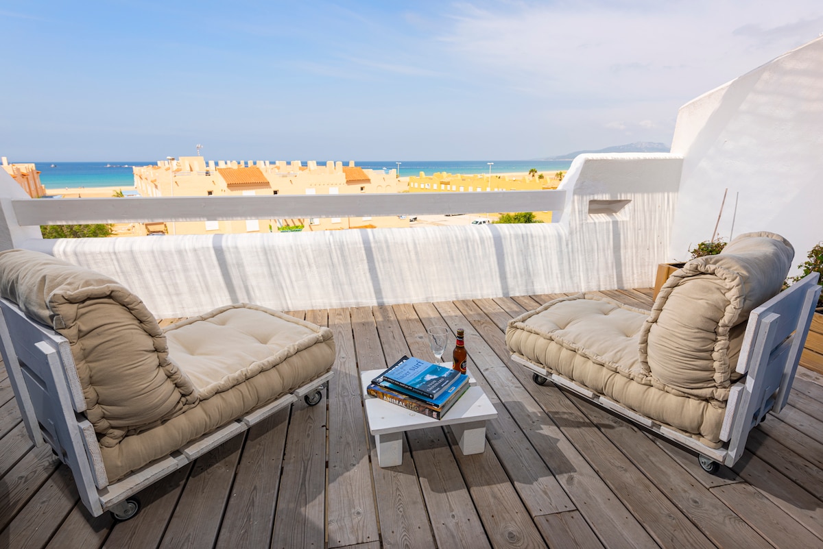 Luxury penthouse, with spacious terrace on the beachfront of Tarifa. 2 bedrooms. Private paid parking. Pool available from June to September. 1 minute from bars and restaurants. 7 minutes from the historic center. Air-conditioned. Fully equipped kitchen with dishwasher, washing machine, microwave, oven... South-facing. Terrace protected from the Levante wind with an electric awning. Crib and high chair available upon request. Penthouse with direct views of the beach. VUT/CA/00044