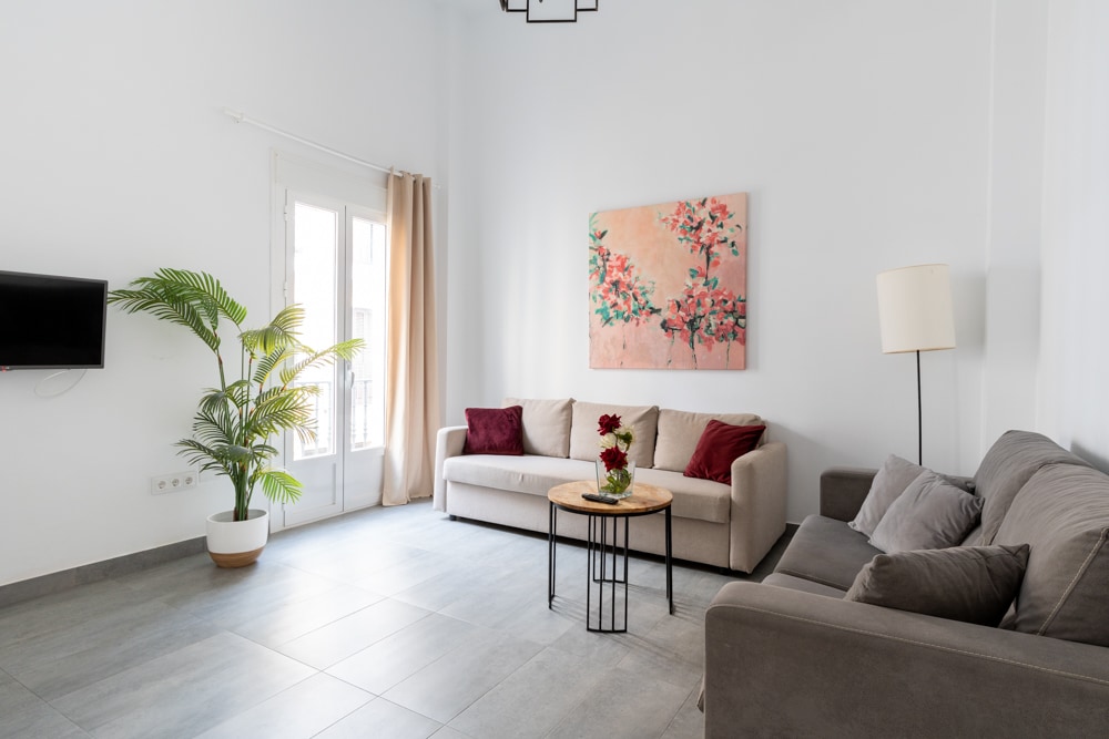 Apartamento de un dormitorio moderno y luminoso, con posibilidad de cama doble o dos camas individuales. Tiene un baño con secador de pelo y bañera, en su acogedor salón tiene un sofá cama doble y una TV de 43’’. En su cocina tipo americana pueden encontrar todo el menaje necesario. Reformado y equipado en Mayo de 2020.