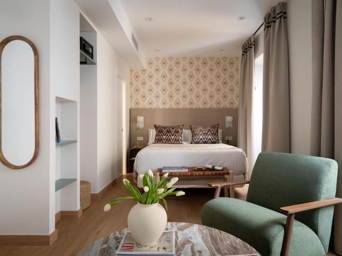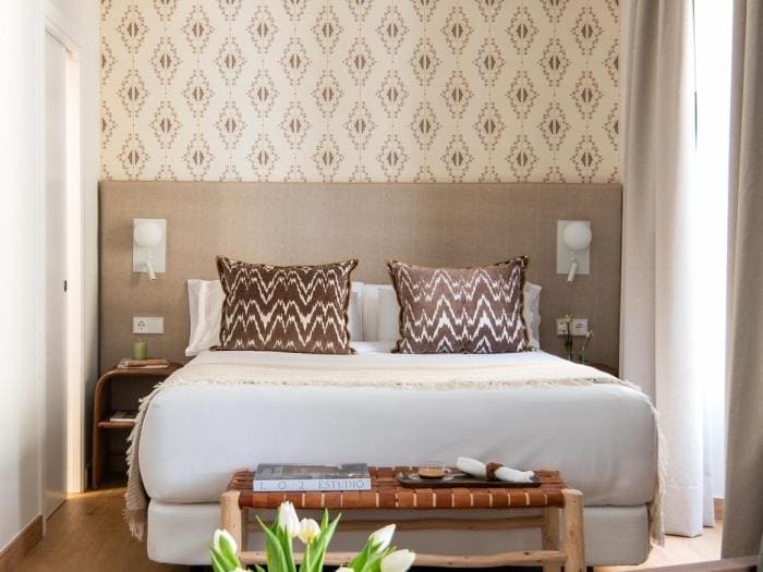 Habitación doble con cama de matrimonio, con la posibilidad de añadir una cama individual. Habitación insonorizada y dotada de todo lo necesario para una estancia cómoda y placentera: baño completamente equipado, Televisión Smart TV, escritorio, climatización por suelo radiante, WIFI gratuito y cargador USB para móviles. También ofrecemos servicio de desayuno por el precio de 2'95€ por persona.