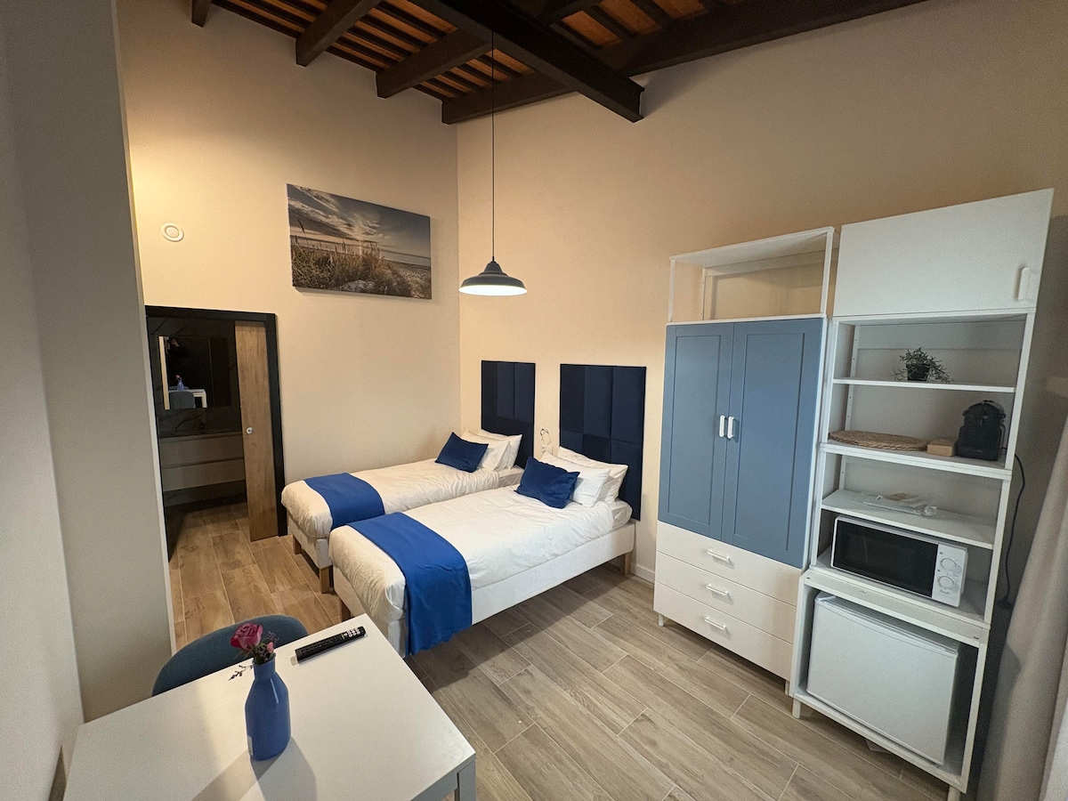 Está habitación está en el mismo centro de la ciudad, compuesta de dos camas individuales. Aire acondicionado frío/calor y en la misma habitación se dispone de ducha y lavabo con espejo., el inodoro está fuera señalizado y se comparte con una sola habitación Espacio para guardar la ropa. toallas y sábanas a la llegada. La habitación está ubicada en un segundo piso sin ascensor Recorre las tiendas y los restaurantes más populares desde este práctico alojamiento.