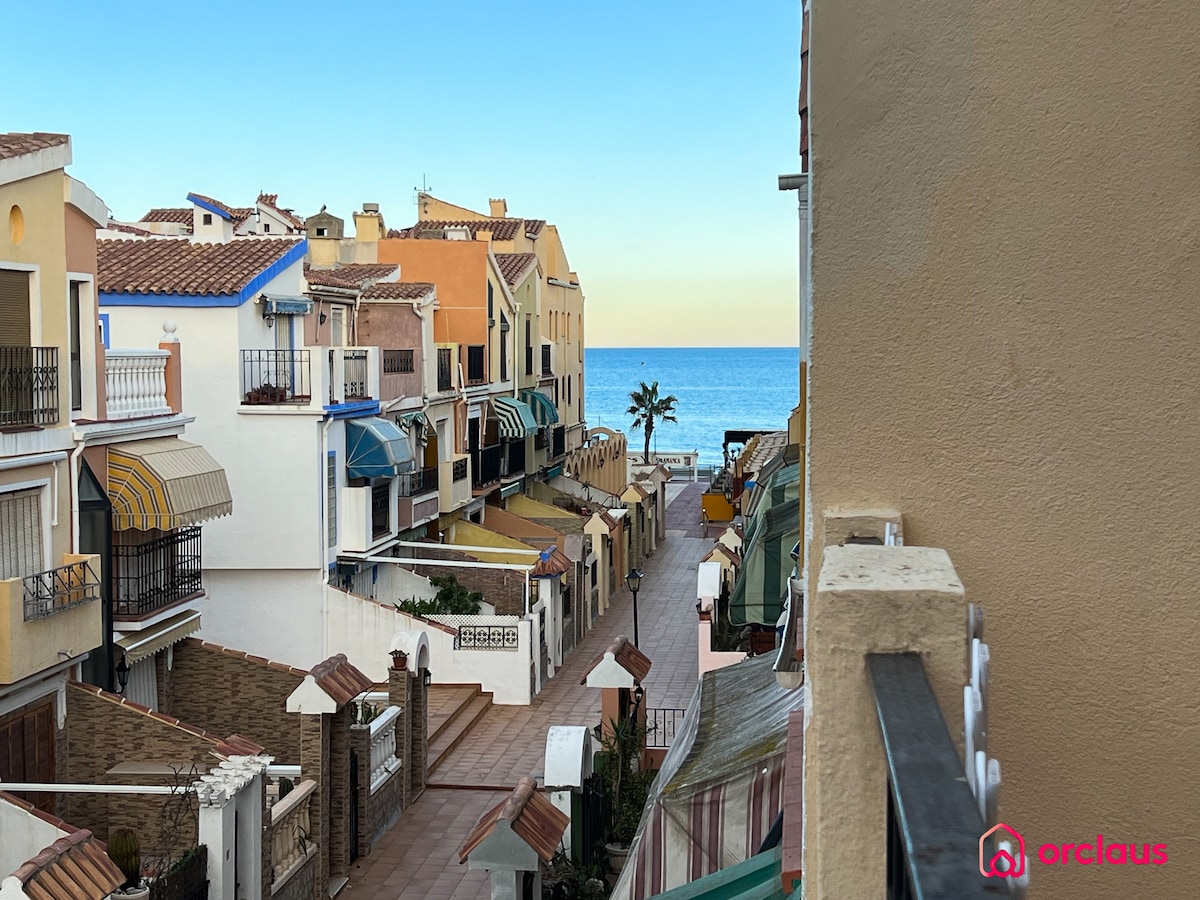 3 floor townhouse facing the sea with private pool, with sea views. Located on a beach with blue flag quality water. Flat with porch, three bedrooms, three bathrooms, three terraces. Double bedroom with terrace overlooking the sea. Double bed, four single beds. Porch with outdoor dining table with sofa and chairs. Perfect for digital nomads. Enjoy the sea breeze on the terrace eating a Valencian paella.