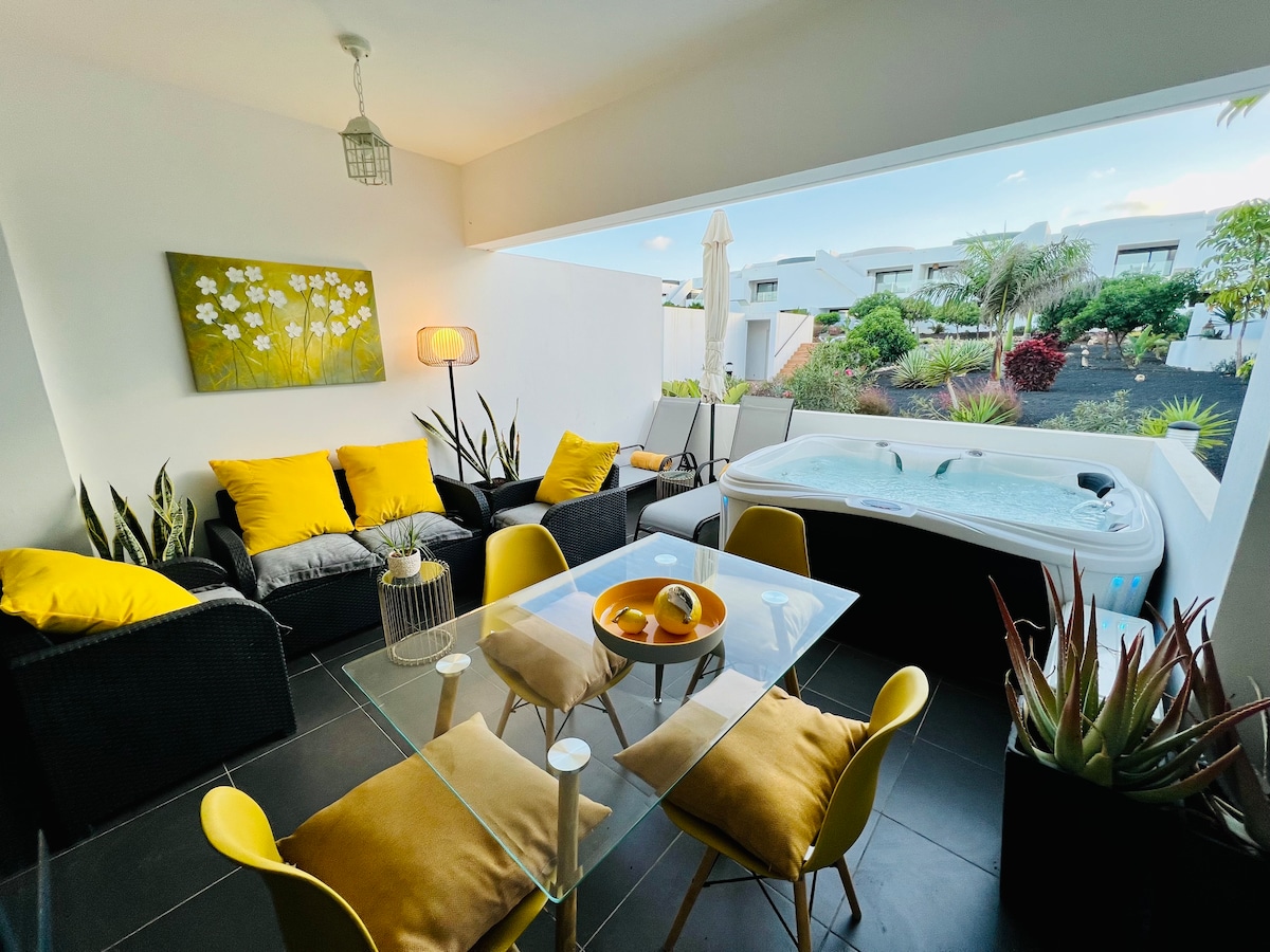 Nice independent villa in Playa Blanca. At the foot of the Montaña Roja volcano, quiet and facing south. Tropical garden on black volcanic scoria and swimming pool heated to 28°C. Outdoor shower. 2 covered terraces with garden furniture, deckchairs, Balinese bed and covered outdoor dining area. Private parking. Entrance, large living room, well-equipped kitchen, 1 en-suite bedroom with marble bathroom and dressing, 1 double bedroom with dressing and marble bathroom 50Mbps WiFi, Smart TV 55th.