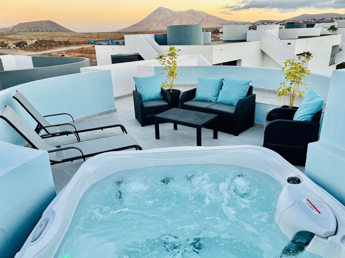 The bungalow is situated on the slopes of a volcano,Montaña Roja,2.5 km far from the center of Playa Blanca.There are two bedrooms with built-in wardrobes,equipped kitchen/living room,bathroom with a big walk-in shower and and two private terraces with barbecue, hammocks, Jacuzzi and swimming pool for the exclusive use of our clients. Air conditioning in the rooms and in the living room.Accommodation with tourist license.
