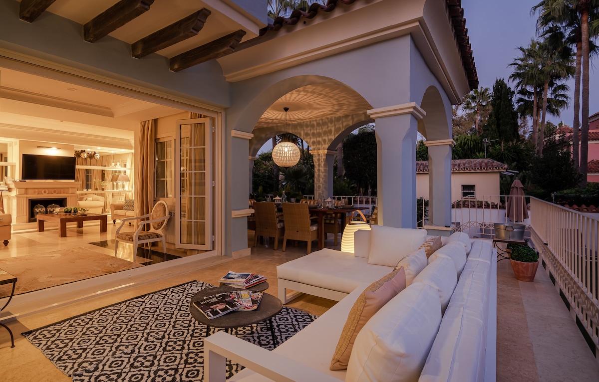 Luxury villa in prestigious area on the beach with private pool. Only 30 steps to the beach. Excellent quiet location. Chill out south-facing terrace with sea views. 15 minute walk into Puerto Banús along the beach promenade. 2 mins walk to promenade restaurants, chiringuitos, bars & beach clubs. A car is not necessary, however there is a private garage and free off street parking. *Important Notice* CLEANING AND LAUNDRY FEE OF €300 HAS TO BE PAID THE DAY YOU ARRIVE. IT IS NOT INCLUDED