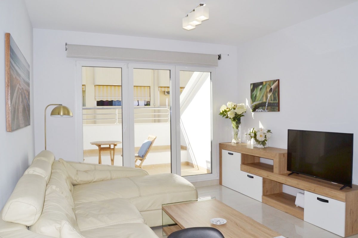 Bright, modern, and welcoming two-bedroom, one-bathroom holiday apartments featuring a fantastic, sunny semi-circular terrace. Just 100 meters from the beach, they are centrally located in Fuengirola, yet in a quiet area close to all services. Ideal for families or groups of friends. Optional parking.