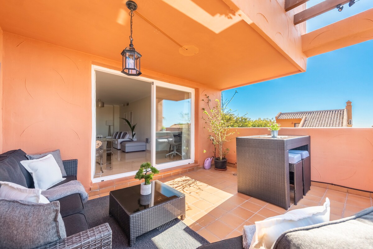 Wake up to breathtaking sea views in this elegant, very spacious 2-bedroom apartment in peaceful El Paraíso close to Estepona, Puerto Banus and Marbella. Enjoy true Mediterranean living on the fully covered panoramic terrace, open and sun-filled in spring and summer, or cosy in cooler months thanks to flexible glass curtains. Relax in the stylish lounge with a large sofa. Just 7 min. to Saladillo Beach. Serene sunny pool area, free parking, close to shops and restaurants and top golf courses.