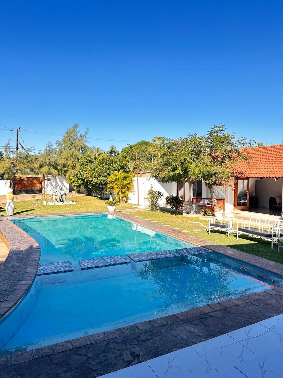 Stay in the welcoming and quaint beach town of Katembe with this spacious, comfortable new home w pool, 15 min to downtown Maputo. Relax in the southern sunset on the large veranda listening to the calls of local birds. Enjoy a modern kitchen, open-concept living and dining room, and master suite with king size bed, large windows and private bathroom. The two other bedrooms are also furnished with new double beds. The fenced in yard is very large and has a basketball court and pool.