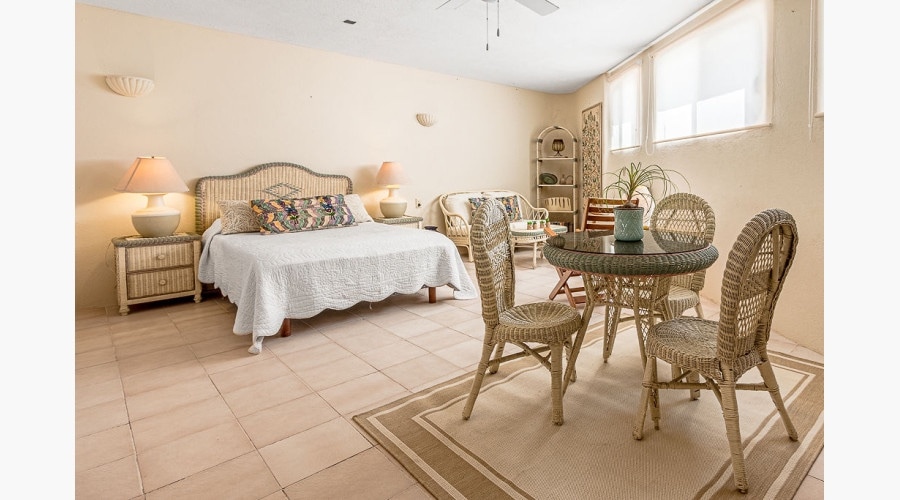 Sol de Energia is a ground floor streetside studio that has a king bed, large bathroom, air conditioning and a fully equipped kitchenette. Open-concept living area is bright and spacious. A private front porch for your morning coffee and dining. Please note that this studio is streetside and even though we have noise cancelling curtains you may still hear some traffic. Daily housekeeping service excluding Sunday and purified water are included.