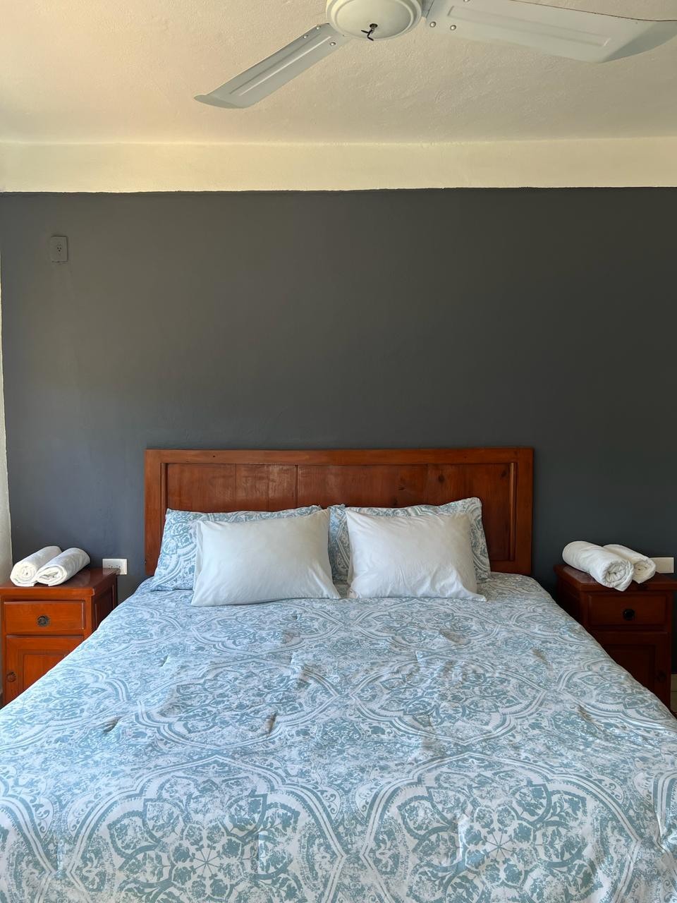 Acogedora y con todo lo esencial, la Habitación palma compacta es perfecta para quienes buscan comodidad en un espacio íntimo. Cuenta con cama king size, aire acondicionado, TV por cable, WiFi, y baño completo. Su pequeña terraza es ideal para leer o tomar un café. Ideal para parejas o viajeros que valoran la tranquilidad, el confort y un ambiente cálido y encantador.