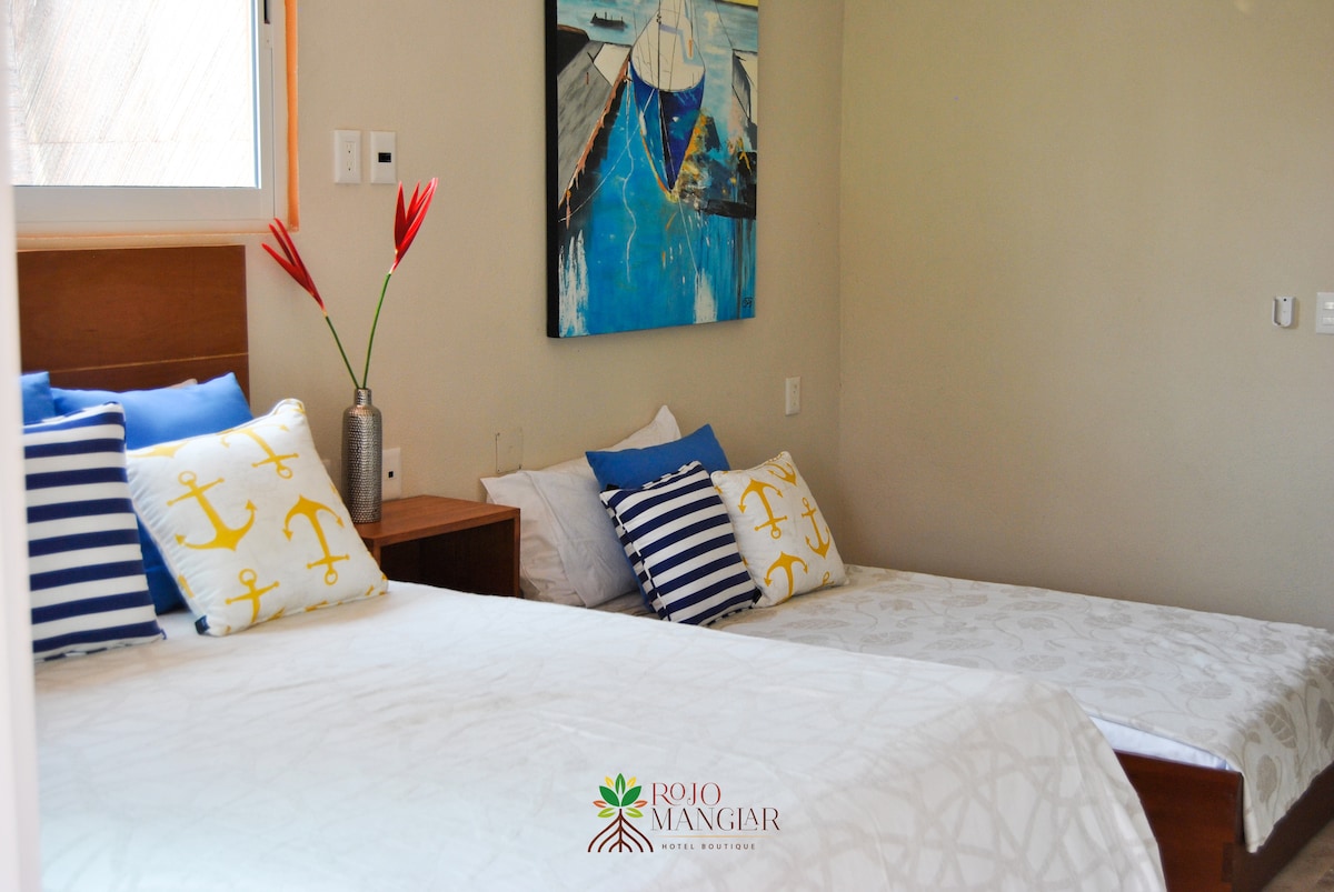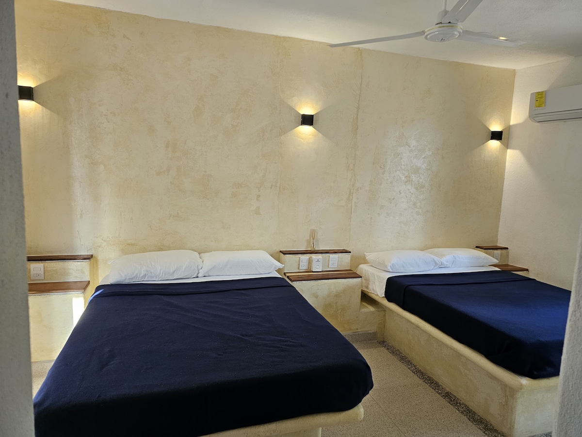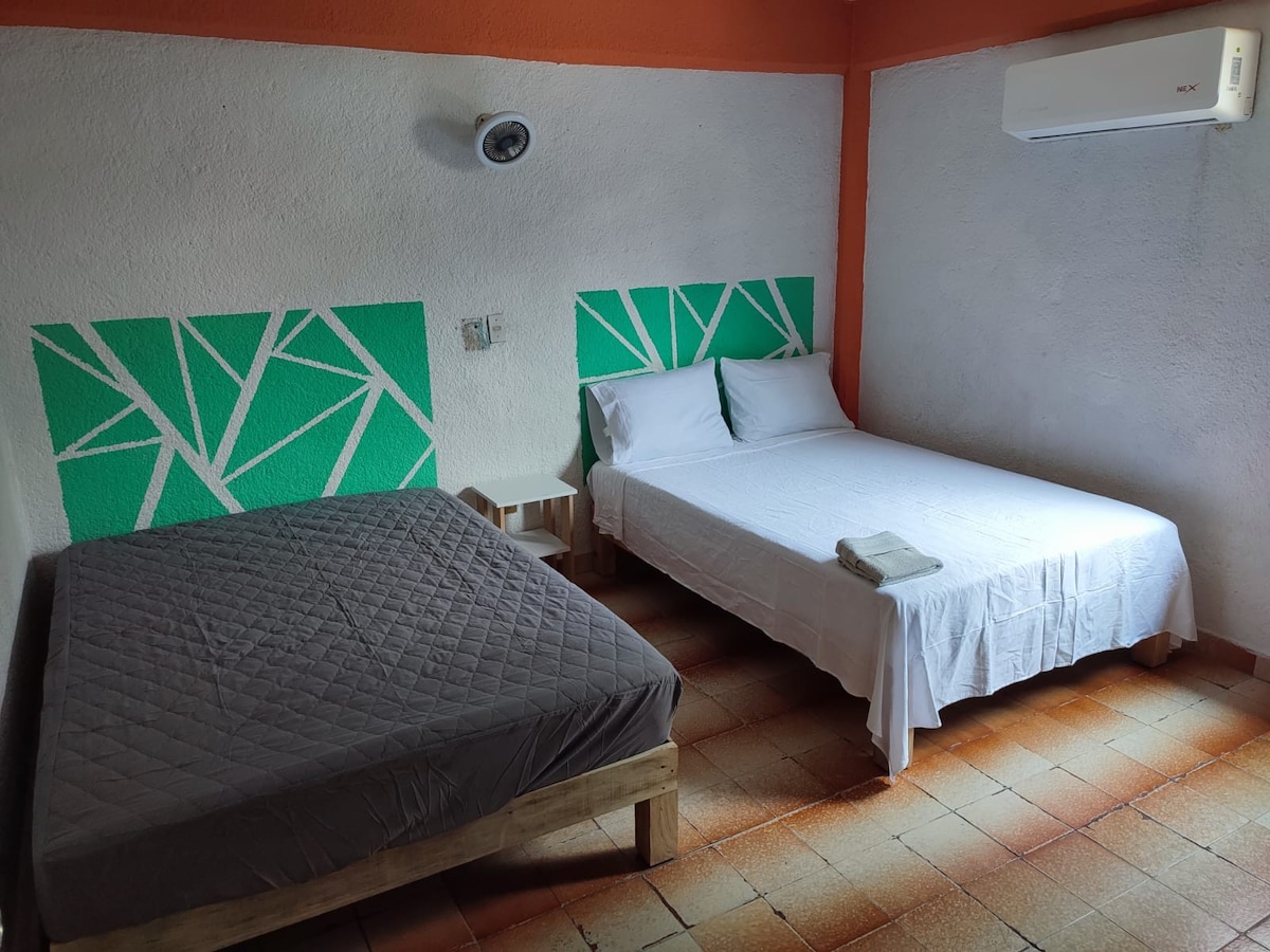 The space is a large room with two queen size beds, a dresser with a mirror and private bathroom with a spacious dressing room. The rooms are in quiet zone, 15 minutes walking to Zihuatanejo's dowtown and the beach. At the entrance there is a restaurant, that also has a open space.