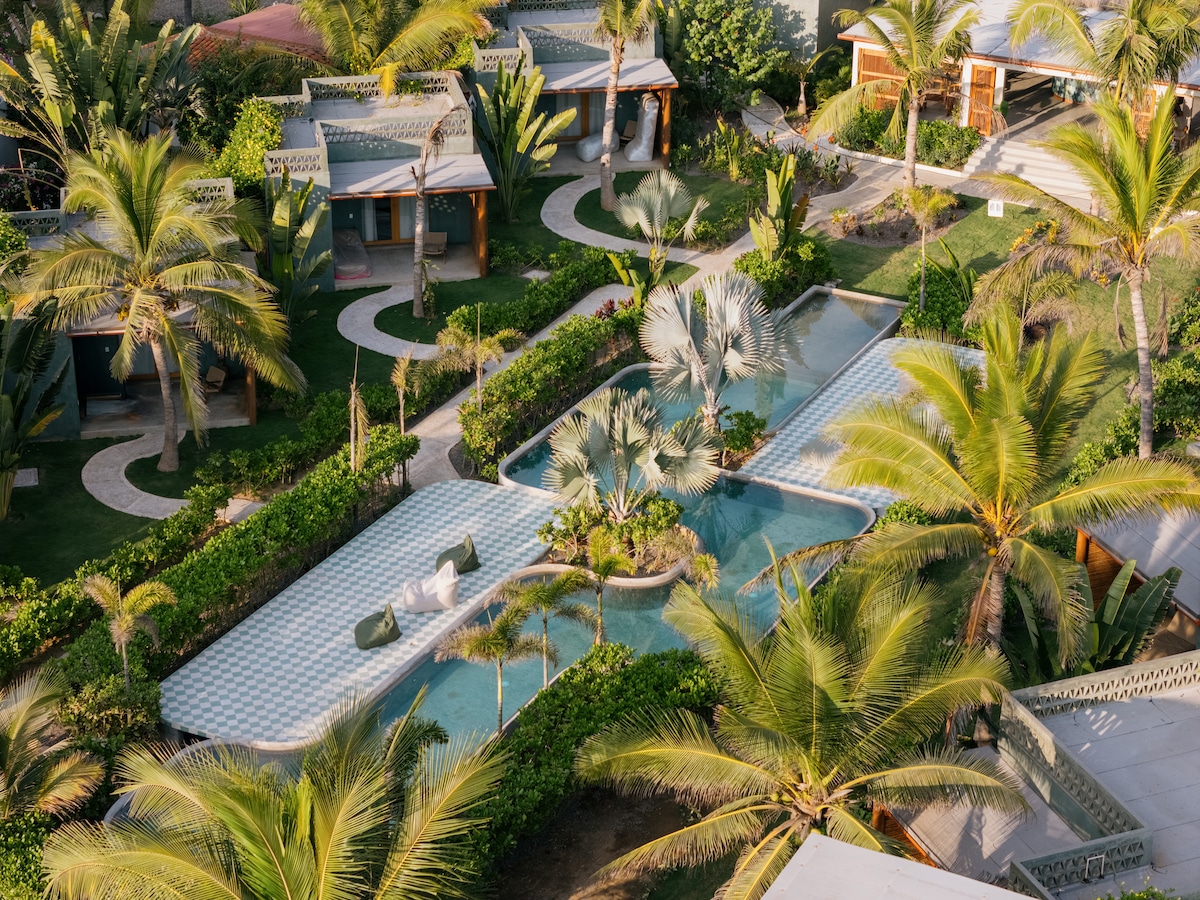 Vive una experiencia única en La Saladita en nuestras exclusivas habitaciones con Vista al mar, un refugio acogedor diseñado para relajarte y conectar con la naturaleza. Cada una de las 6 cabañas cuenta con: Baño exterior privado, que combina privacidad y un toque de naturaleza. Pequeño patio privado con vistas directas a la alberca, ideal para disfrutar del ambiente sereno y refrescante.