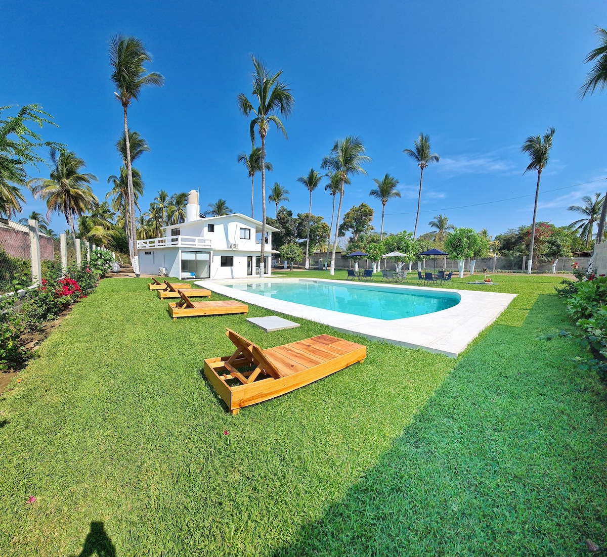 Disfruta de una estancia relajada en nuestra casa cerca de la playa con alberca entre árboles y palmeras, ideal para pasar días tranquilos en familia. Cuenta con 4 recámaras con aire acondicionado; 2 con baño privado y 2 que comparten baño exterior. Medio baño adicional. Sala y comedor amplios, cocina equipada (sin aire en áreas comunes). Disfruta la vista al jardín y alberca, con estacionamiento para 3 autos, en un ambiente cálido y cómodo.