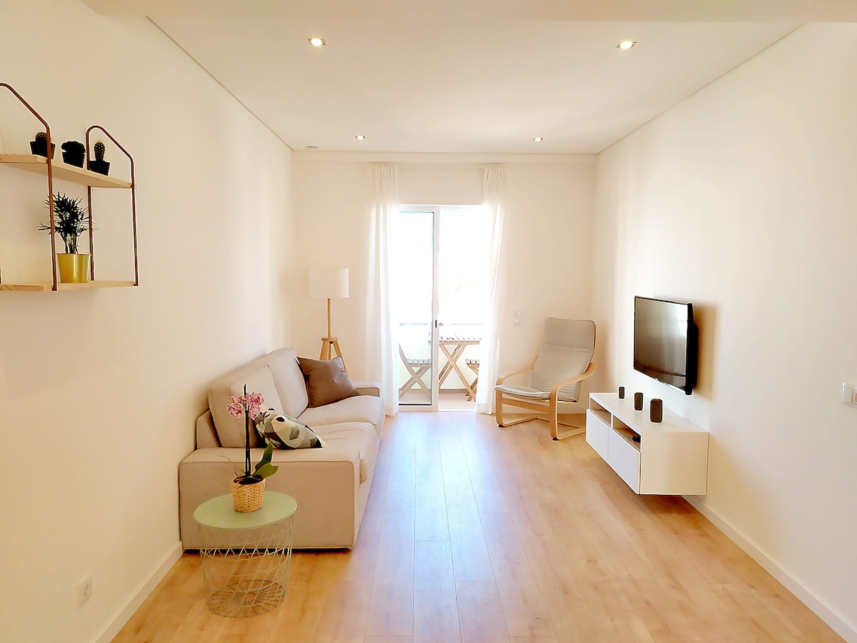 Spacious, comfortable 3-bedroom apartment on 7th floor with fantastic view looking out to sea. Two bathrooms:1 walk-in shower, 1 bathtub. Balconies surround. Large eat-in kitchen. All amenities provided, incl. Wi-fi, satellite TV with major languages, Blu-ray player & DVDs. Bed linens, towels, beach towels, shampoo, soap provided. Thoughtful welcome basket! On main street of Olhao, short walk to train, bus, waterfront, ferry to the islands & beaches. Restaurants, groceries and services nearby.