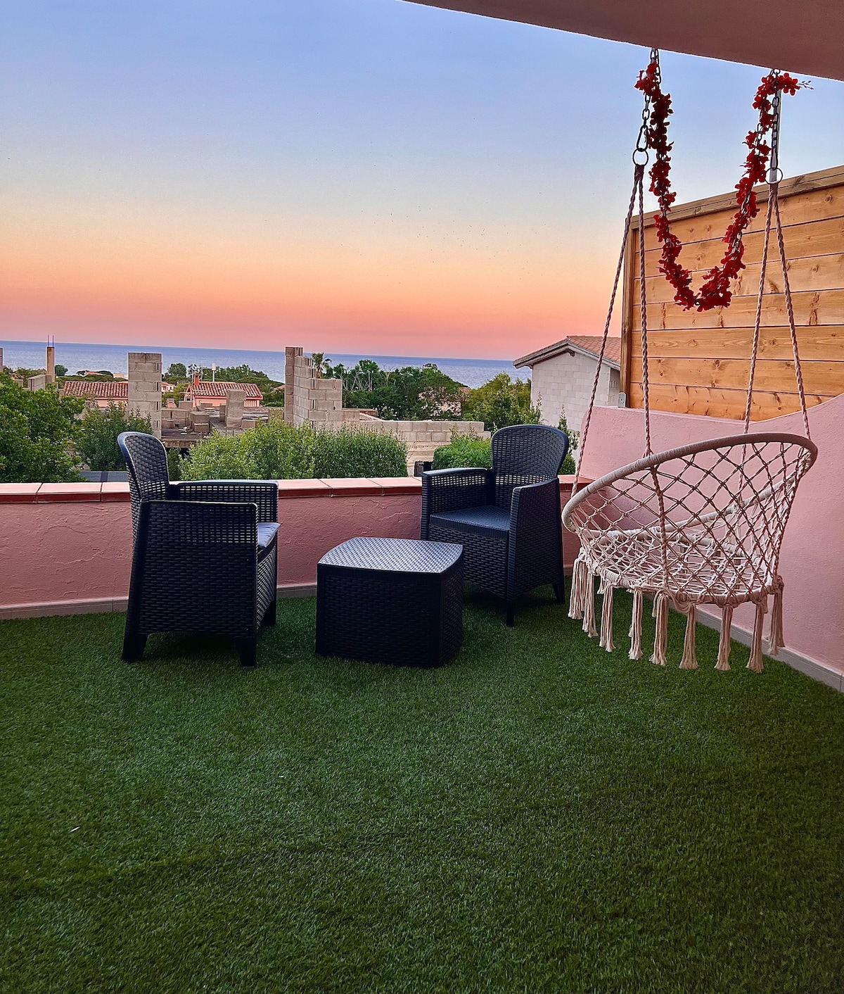 La villetta indipendente dista 800 metri dal mare e gode di una bellissima vista panoramica. La casa è dislocata su due livelli. 1° zona giorno: giardino con loggiato, munito di barbecue e ideale per i pasti, dal quale si accede all'angolo cottura e al salotto, dotato di bagno di servizio. 2° zona notte: camera matrimoniale, camera con letto a castello e bagno. Nelle camere sono presenti due letti apribili. Nel retro è presente uno spazio attrezzato con due docce, di cui una semichiusa.