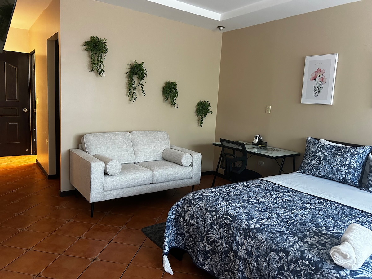 Pick up at the airport (on schedule) by small fee, 2 unts more, cars for rent, airport stay 2km, ideal to rest before after long trip, new studio with kitchen, 1 bedroon, AC, priv bathroom, safe, TV Netflix, hot water, fully equipped, terrace BBQ, 2min to foot of semi-private paid club with pools of pure and cold spring water, close to airport, car rentals, restaurants, shopping, train and bus stop, easy access to the roads that go to Sjo or the Pacific, 30min from Poas Volcano, Starbucks farm
