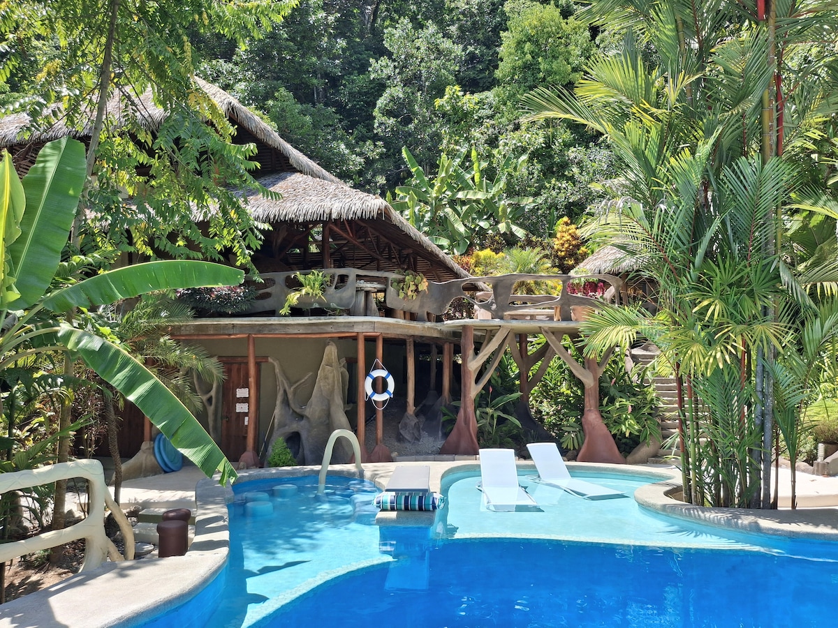 Luxury Jungle Tree House Eco-Retreat in the Corcovado Corridor – Large Extraordinary Pool, Wildlife, Birdwatching & Private Yoga Deck with Surfing nearby. Off-grid, solar powered, this handcrafted, unique home is a private resort cradled by nature. It is one of the most remarkable homes in Matapalo, if not the whole of Costa Rica. With continuous rainforest connecting to the famous Corcovado National Park, the wildlife viewing is unrivalled with monkeys and macaws daily visitors. Pura Vida!