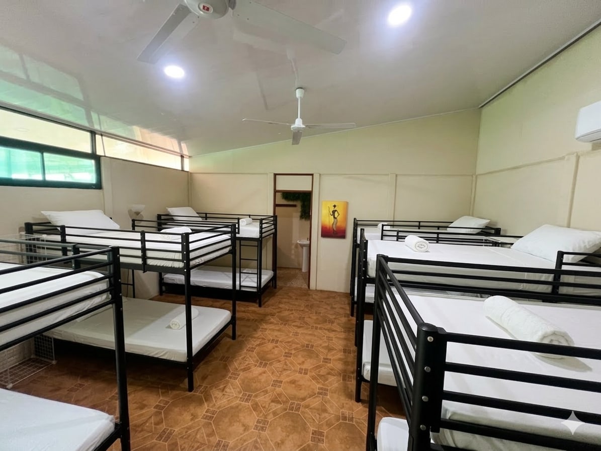 4/5-bed mixed dorm. The beds in this air conditioned dormitory have private curtains, reading light and power outlets. A locker is assigned for each bed. 3 shared bathrooms outside of the room, there is a shared terrace overlooking the beach, hammocks and chairs on the beach. Room Size 20 m² Located in the second floor Fully equipped community kitchen. Optic fiber Wi-Fi. No Smoking.