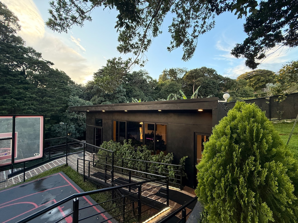 Made of a recyclable container ♻️ artistically designed with wood 🪵exótica ,porcelain tile walls, next to it you have a private path to walk, a waterfall next to it / you are in harmony with nature/the sink is made of natural stone 🪨/ the bathroom is panoramic, there is an area with a view of the volcano 🌋 and the City we are inside a Private residential. We have a mountainous path and a Hamaca bridge 5 minutes away There are menus from local restaurants, also equipped to cook 🍜🍲
