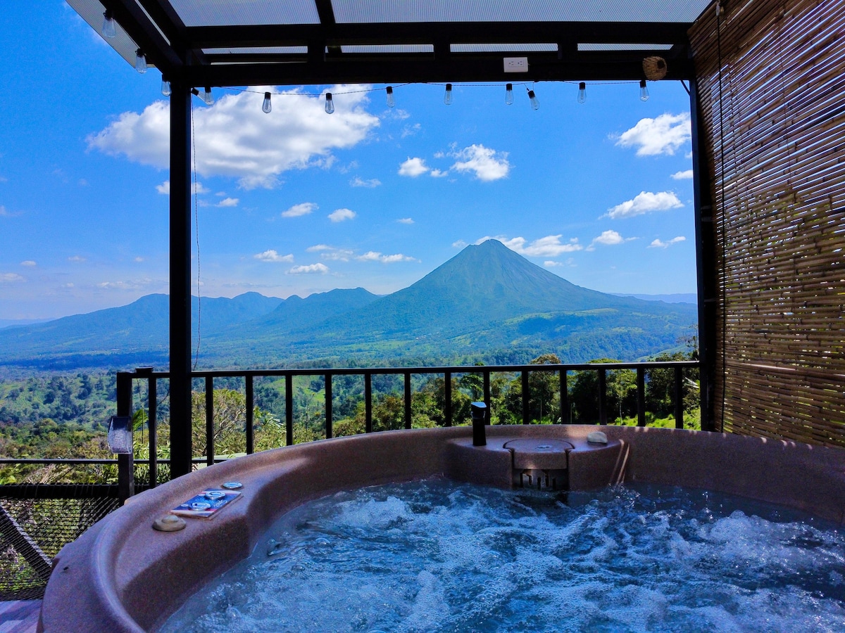 Rodeado de los colibríes y su sonido. Combinamos comodida y naturaleza en un entorno espectacular. La joya del lugar es, sin duda, su vista panorámica, desde su balcón privado se puede admirar el volcán que domina el horizonte, así como el hermoso valle que en la noche se ve bañado por las luces de la ciudad. La experiencia nocturna es encantadora con la fogata que da calidez y crea una atmósfera acogedora y romántica así como su cama flotante en la cual puedes disfrutar de una noche estrellada.