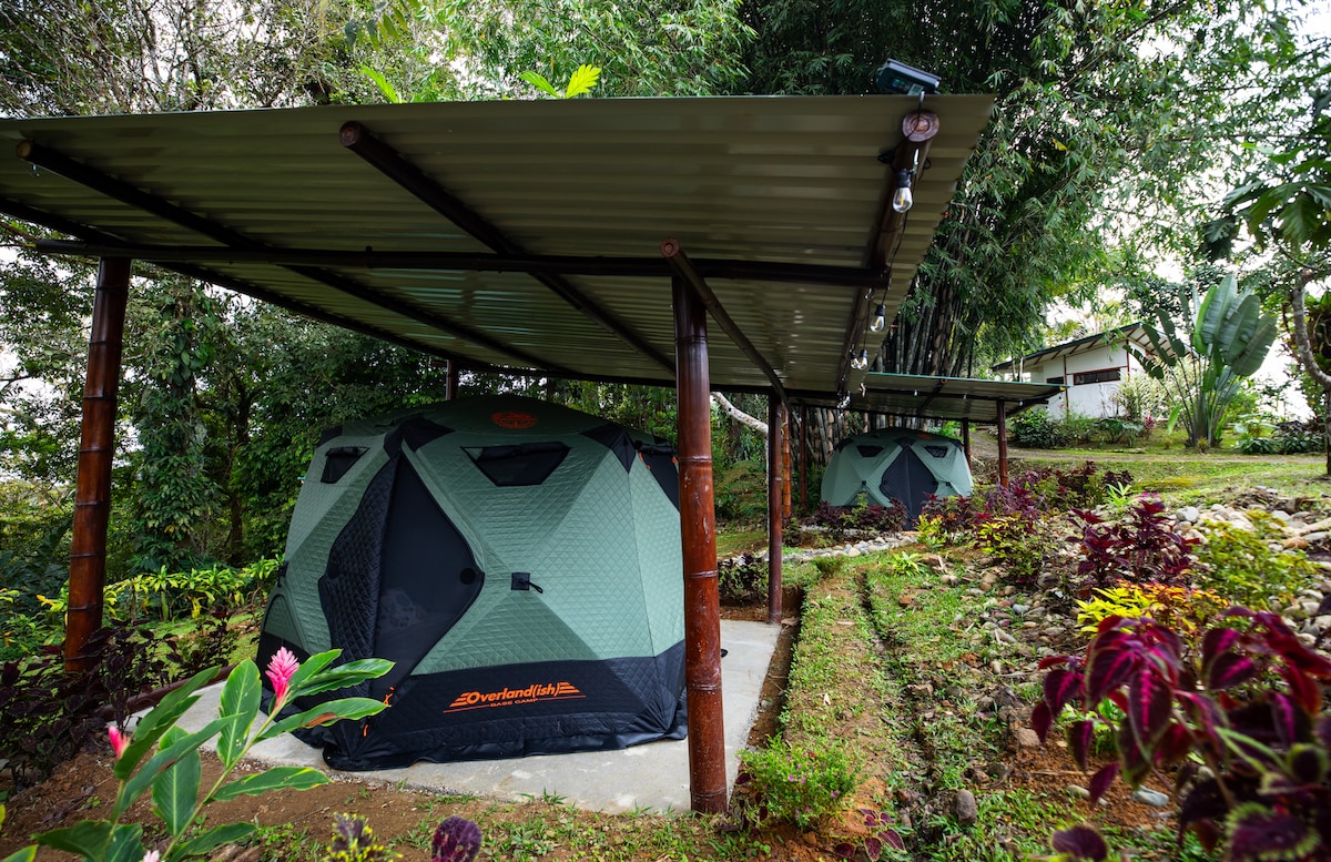 Nuestro alojamiento único en propiedad privada te espera. Accede a través de un sendero a una tienda acogedora, rodeada de exuberante selva. Relájate en el jacuzzi privado o disfruta de las vistas desde la terraza. Cuenta con una cocina completamente equipada. Cada detalle está diseñado para ofrecerte un refugio único, donde la tranquilidad y el romance se entrelazan perfectamente.