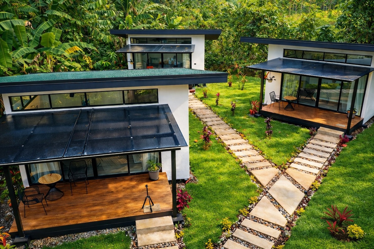 Jaguar Houses is conveniently located between the center of town and some of the most popular attractions in the area such as Canopy Zip Lining, Suspended Bridges and the Santa Elena Nature Reserve. Inspired by Nordic architecture, Jaguar is composed of 3 independent homes, elevated on pillars, giving you the impression of floating on the trees. The 3 houses are identical however the view can slightly change from one to another. The photos used for each listing are a mix of the 3 houses.